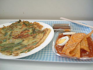 食の会場で本場韓国料理を味わう。 ちぢみとトッポギ