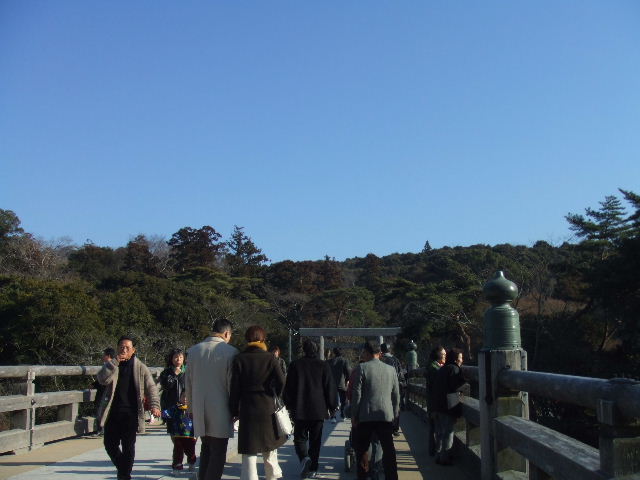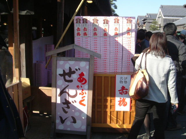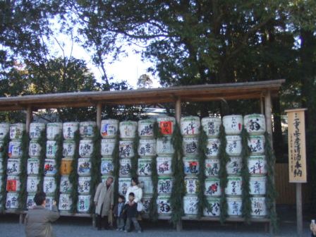 宇治橋を渡り、参道を歩くと、厳粛な気持ちになります。 三重の地酒の樽酒が並ぶ。