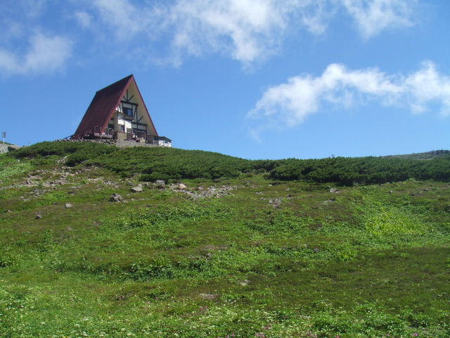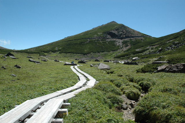 | 不動岳・遠くにコロナ観測所が見えます。 | 見ごろのお花畑は、整備された散歩道を歩き散策します。 | 山頂の郵便局 |