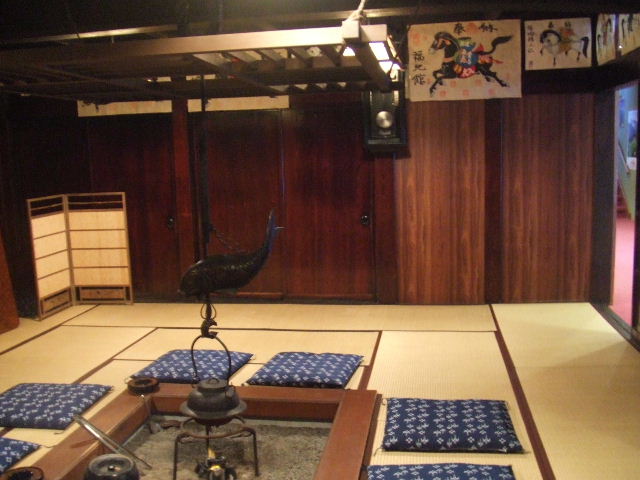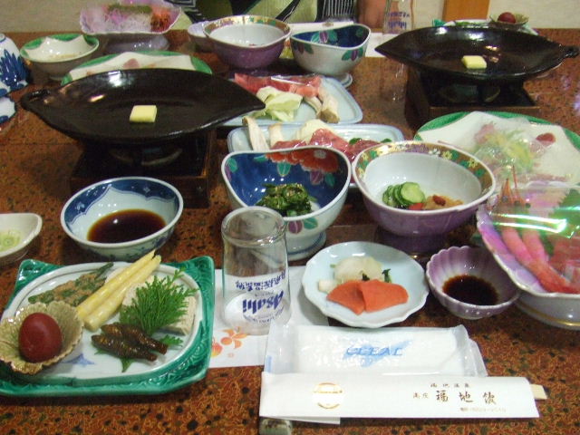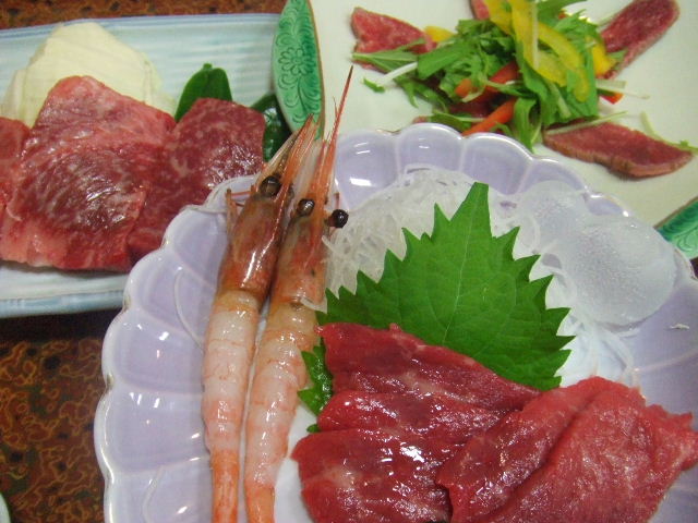 | 食事はまたたびの食前酒に始まり、山菜、岩魚の塩焼きと続き・・テーブルははごちそうがいっぱい。 | 飛騨牛の刺身・たたき・陶板焼きと食べきれないうれしさ。 | 囲炉裏の部屋ありも落ち着いた宿です。 |