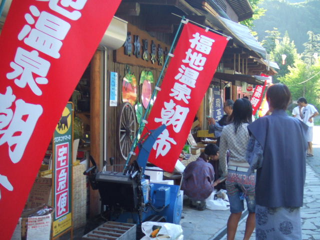| 朝食前に昔話の里での朝市まで散歩 | 果物や野菜やジュースが冷たくておいしい | 朝市には奥飛騨の特産がたくさん並べられています。 |