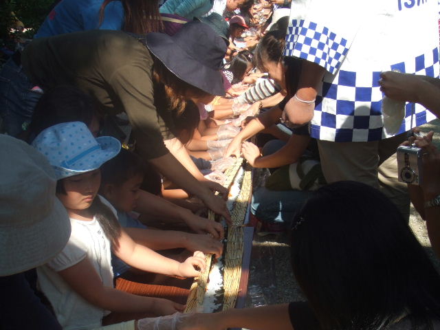 神社内では、長い海苔巻き寿司を大勢で作っていました。