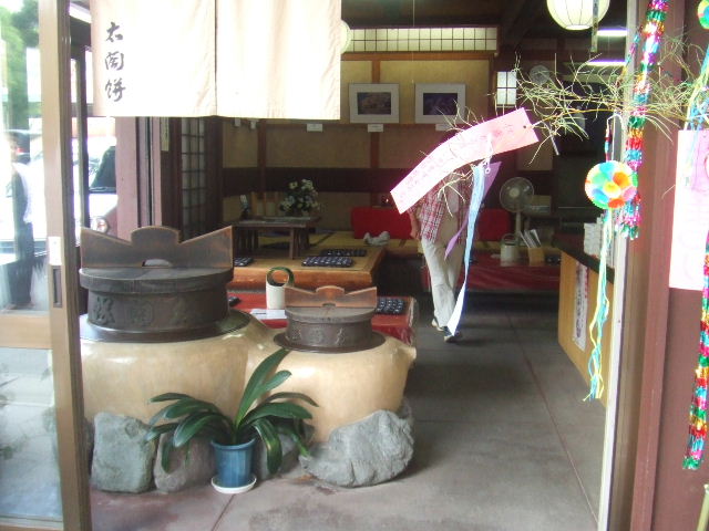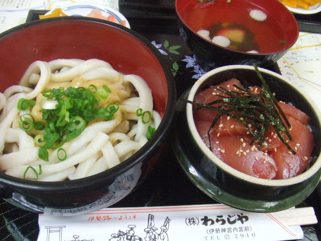 | 門前町は七夕とお木曳きムードで、華やかです。 | 道行く人が、短冊に願いを書き笹に飾ります。 | わらじやで伊勢うどんとてこね寿司セットをいただく。 |
