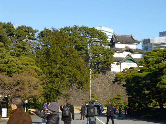 皇居内は大勢の人で、大混雑状態。 戻ることもできず、ひたすら歩きます。 二重橋を渡り、伏見櫓横の門を潜り宮殿へ入ります。