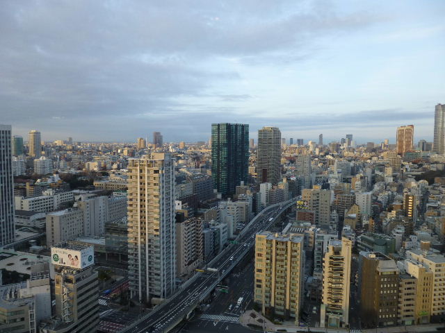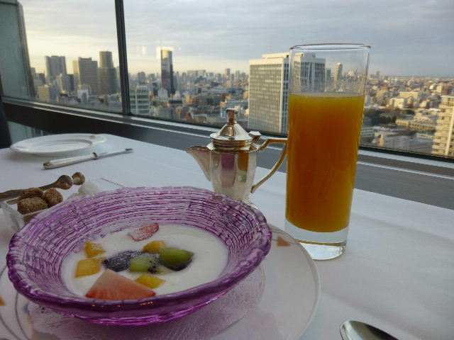 朝日に照らされた東京のビルを眼下に見ての朝食です。