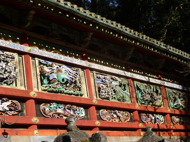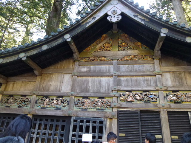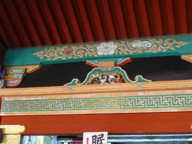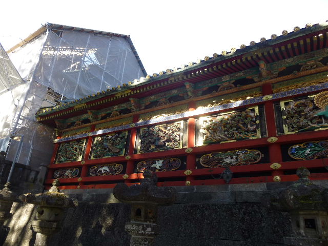 猿の一生を描きながら、人間の生き方を伝えているそうです。とても愛らしい表情をしています。 陽明門は6年後まで、改修工事中。 塀の彫刻も煌びやかで見事です。 奥に進むと、奥社参入り口に眠り猫の彫刻がありました。 |