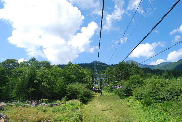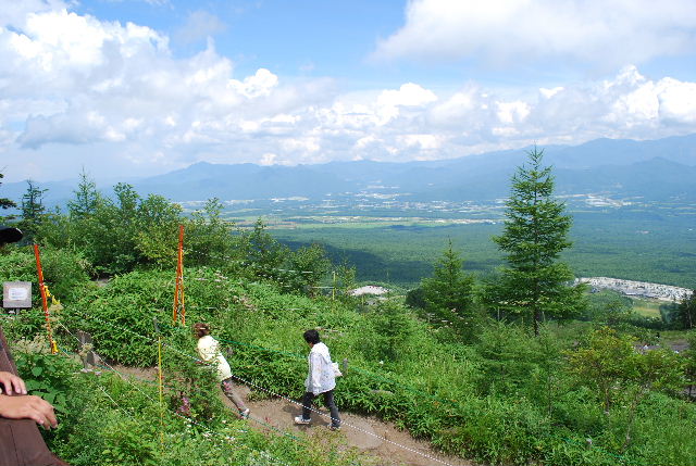 | リフトに乗り標高1,900mの山頂から麓を一望します。 | 富士山も遠くに見え、夏空がとてもまぶしい。 |