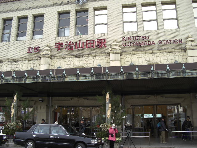 りっぱな門松の飾られた宇治山田駅をスタート。 |