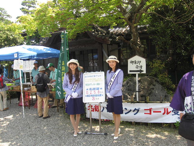 ハイキングのゴールには、ミスかきつばたのお出迎えです。 名物の大あんまきと、知立のオリジナルバッチがあたりました。 |