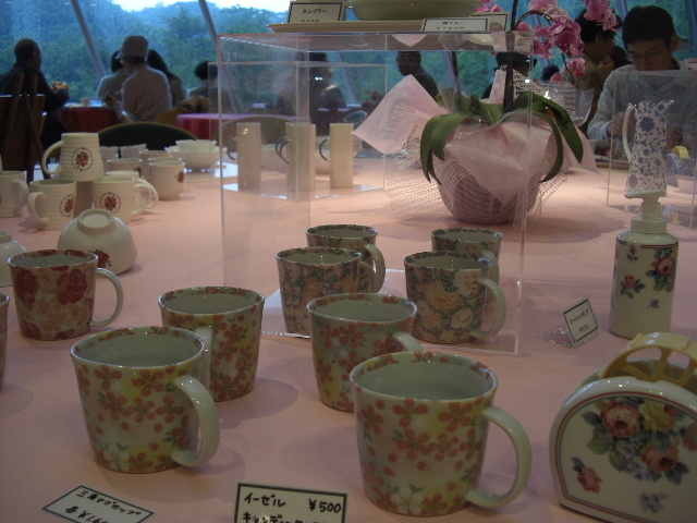 公園内にある喫茶店で休憩。 バラにちなんだ、お洒落なカップ等がたくさん並んでいます。 |