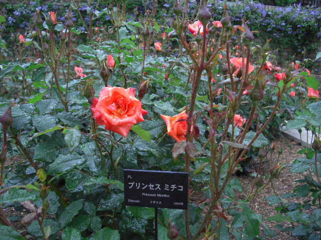りのあるバラを集めた庭園 。 赤みかがったオレンジ色のプリンセス ミチコ |
