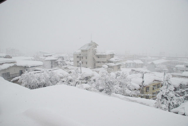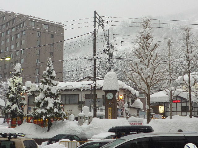 駅前は積雪1m以上ありそうです。 送迎バスは、雪に埋もれそうな温泉街を通り高台にある ホテル双葉に向かいます。 |