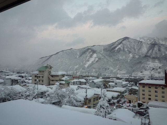 部屋からは 所々に湯煙も見え、雪景色を しっとりと眺めます。 この日は、雪見風呂でゆっくり体を休めました。