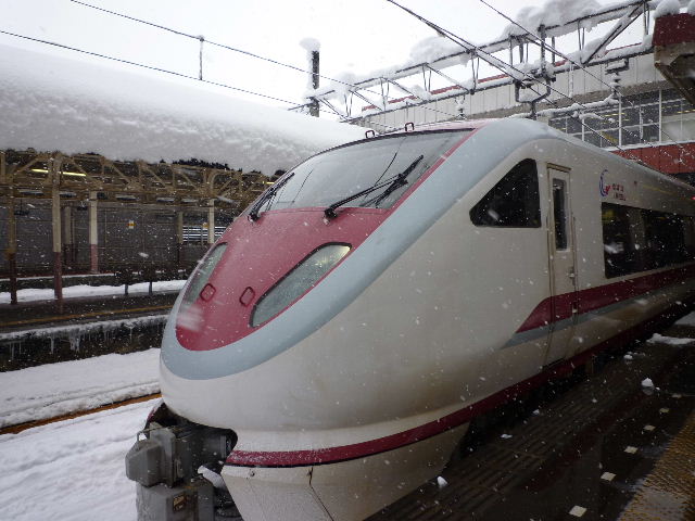 金沢まで 少ない乗客を乗せて、雪の中を走ります。 今回も貸切状態です。 |