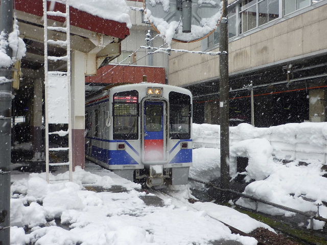 越中八尾行きの普通列車。まだまだ雪は降っています。 |