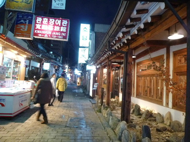 夜には、一昨年、三重大学に留学生として来ていた、Sさんと、Kさんの2人 とホテルのロビーで再会。 韓国情緒あふれる街並みを歩き、韓料理店チョンを案内してくれました。
