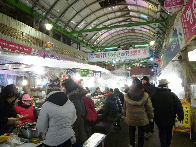 夜は、地元の人で賑わう市場の屋台で、夕食。 多くの屋台が所狭しと並び、とても活気のある市場です。 その後、スパハウスに行き、汗蒸幕(ハンジュンマク)、韓国マッサージ を体験。広い広間は床暖房で、座っているだけでも体が温まり、疲れもとれ そうです。スパハウスでは、タケの友人と合流。異国の地で、話がつきませ ん。