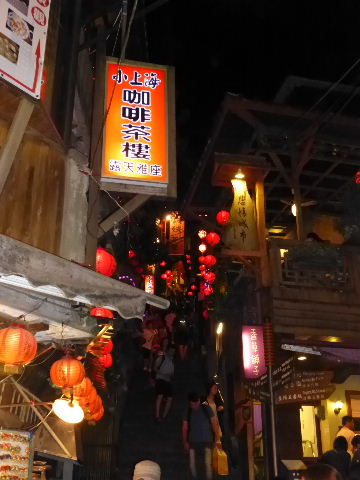 食後は、町の見学。 レトロな町の階段を上ったり、下りたり・・・ 赤い提灯に照らされた、狭い路地の商店街を歩きます。 |