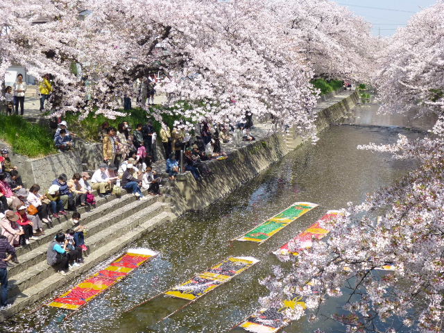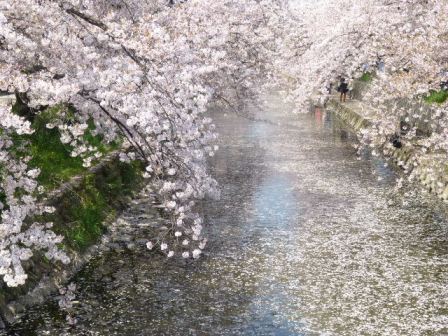 桜吹雪が舞い、川面に流れます。 |