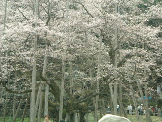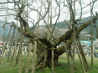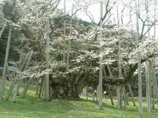 樹齢千五百年。蕾のときは薄いピンク、満開に至っては白色、散りぎわには特異の淡い墨色を帯びてくる。
