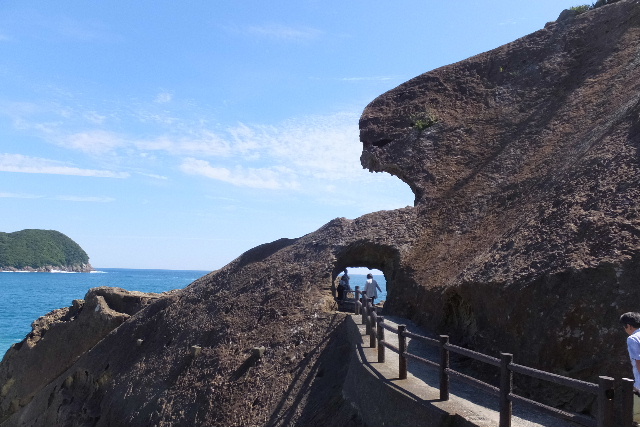 荒波に浸食されたトンネルをくぐります。 海岸沿いの遊歩道は約1,2kmあるそうです。 |