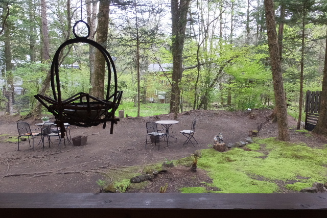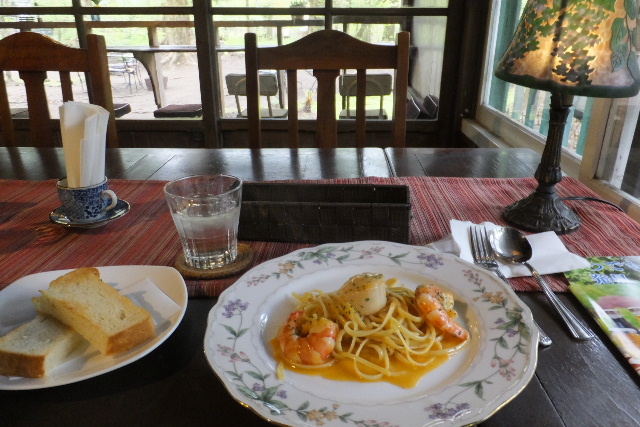 空気がひんやりして、森林浴気分で歩きます。 森の中の、別荘風のレストランで昼食をとります。 |