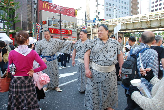 両国国技館周辺は、相撲部屋のお祭りがありお相撲さんが沿道でサービス |