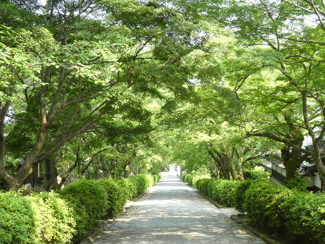 昼食後、日吉大社の参道を歩きます。苔むした石垣と青紅葉の参道は、趣があります。